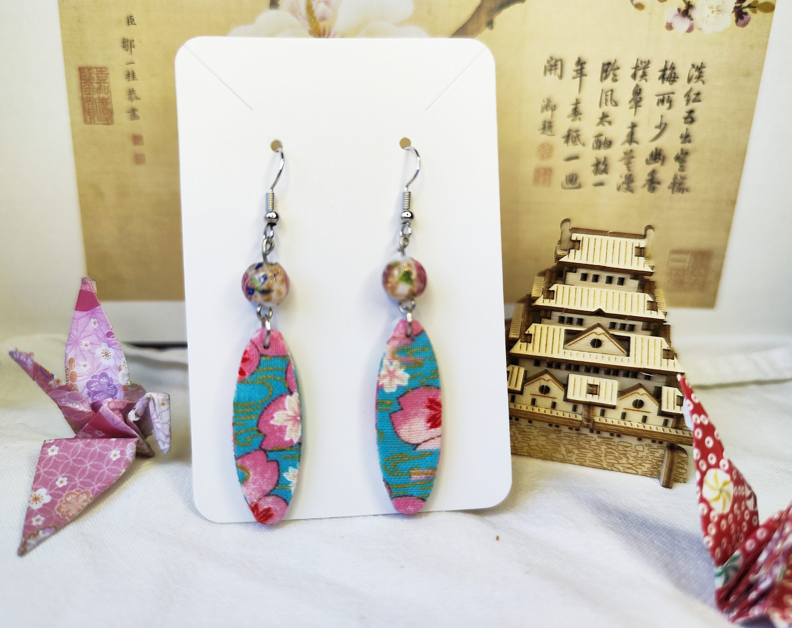 Boucles d’oreilles pendantes argentées, au motif floral bleu japonais, avec perle rosé