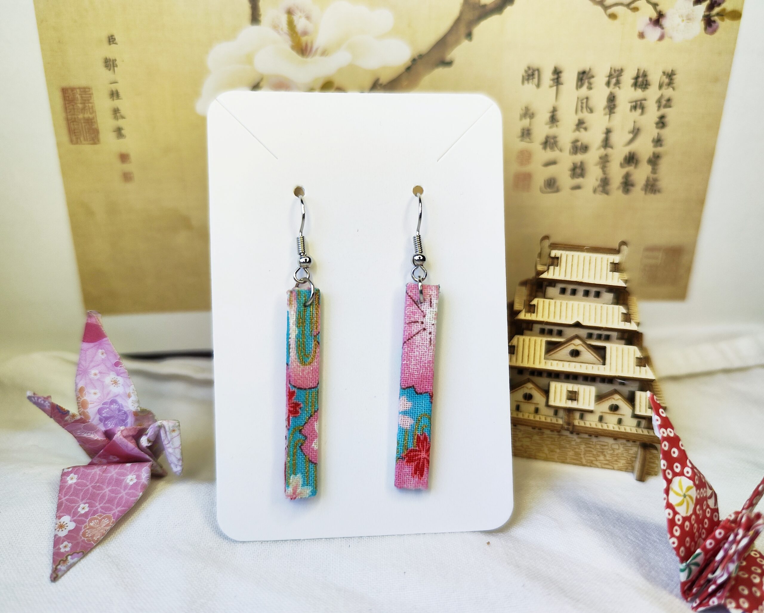 Boucles d’oreilles longues et ultra légères, entièrement habillées d’un tissu bleu fleuri aux touches de rose et rouge, pour une note colorée et élégante à chaque mouvement.