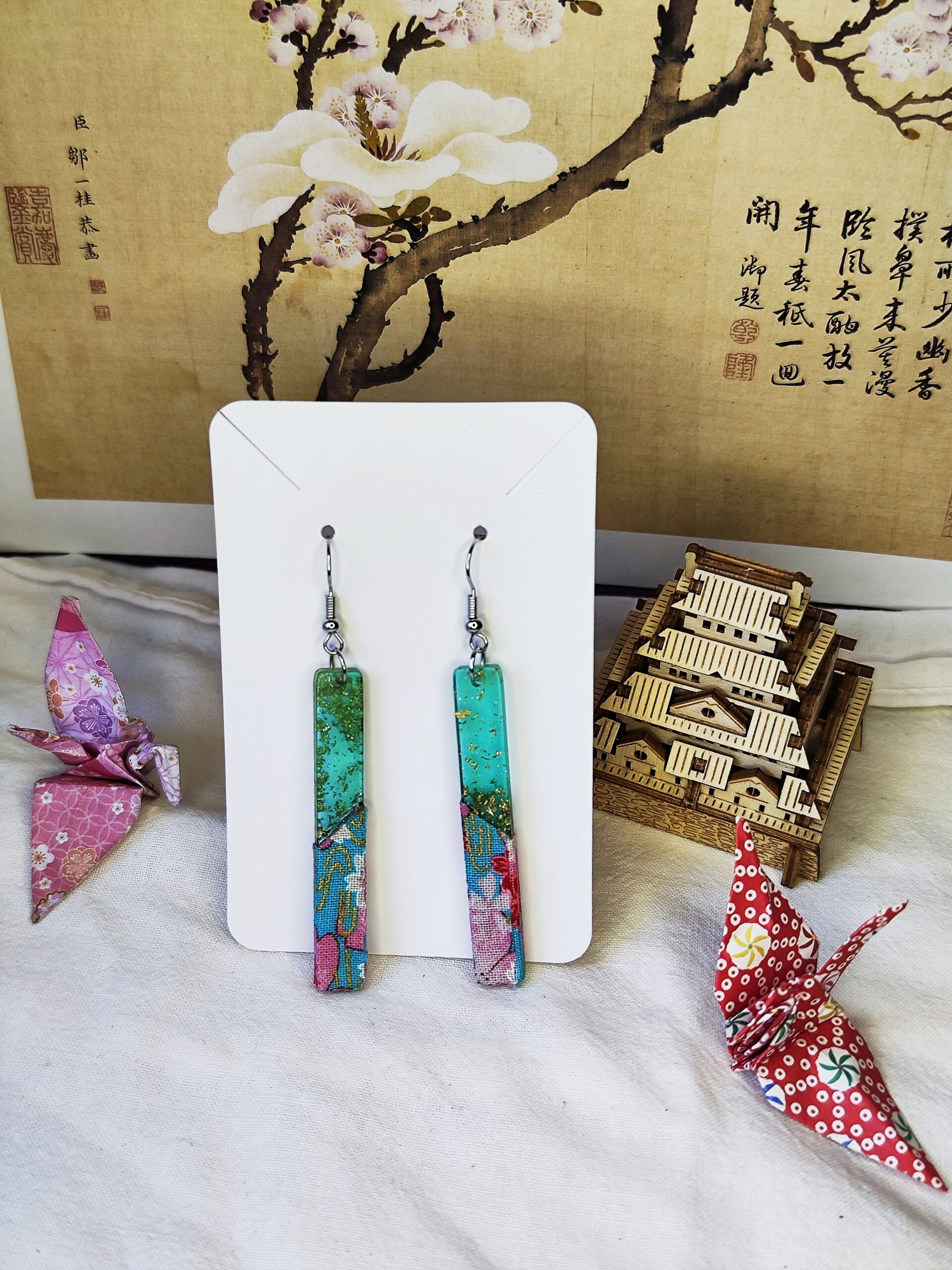 Boucles d’oreilles longues et légères, composées d’un haut en résine bleuté incrustée de feuilles dorées et d’un bas orné d’un tissu fleuri bleu, rose et rouge pour une touche raffinée et colorée.
