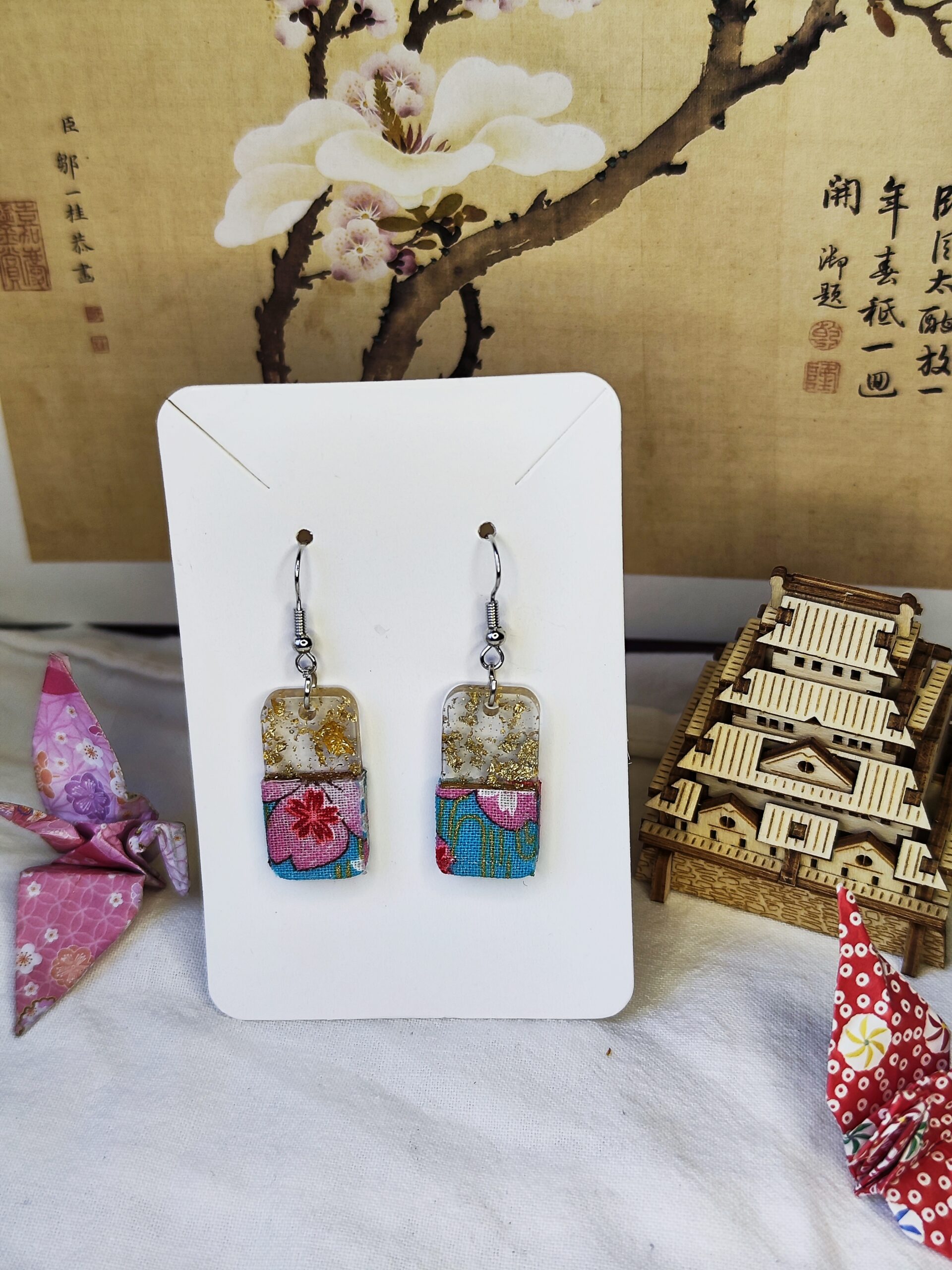 Boucles d’oreilles légères au design rectangulaire, composées d’un haut en résine transparente incrustée de feuilles dorées et d’un bas orné d’un tissu fleuri bleu, rose et rouge pour une touche raffinée et colorée.