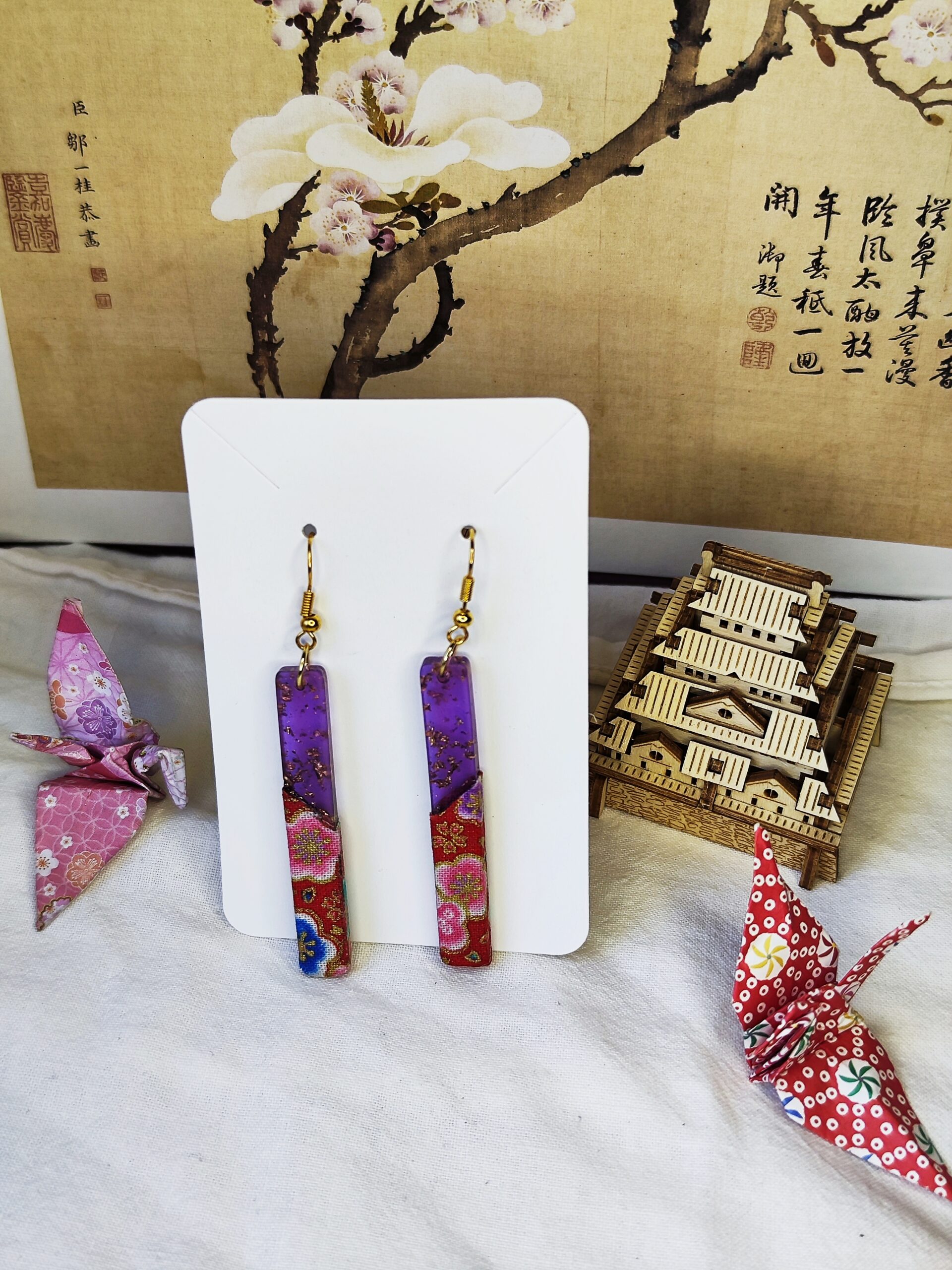 Boucles d’oreilles longues et légères mêlant un élégant effet rosé incrustée de feuilles dorées à un tissu fleuri coloré, pour une touche raffinée inspirée du Japon à chaque mouvement.