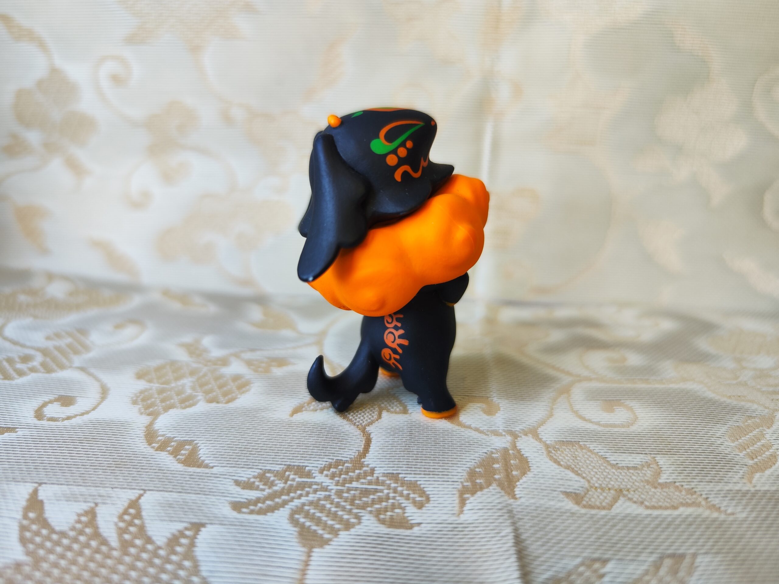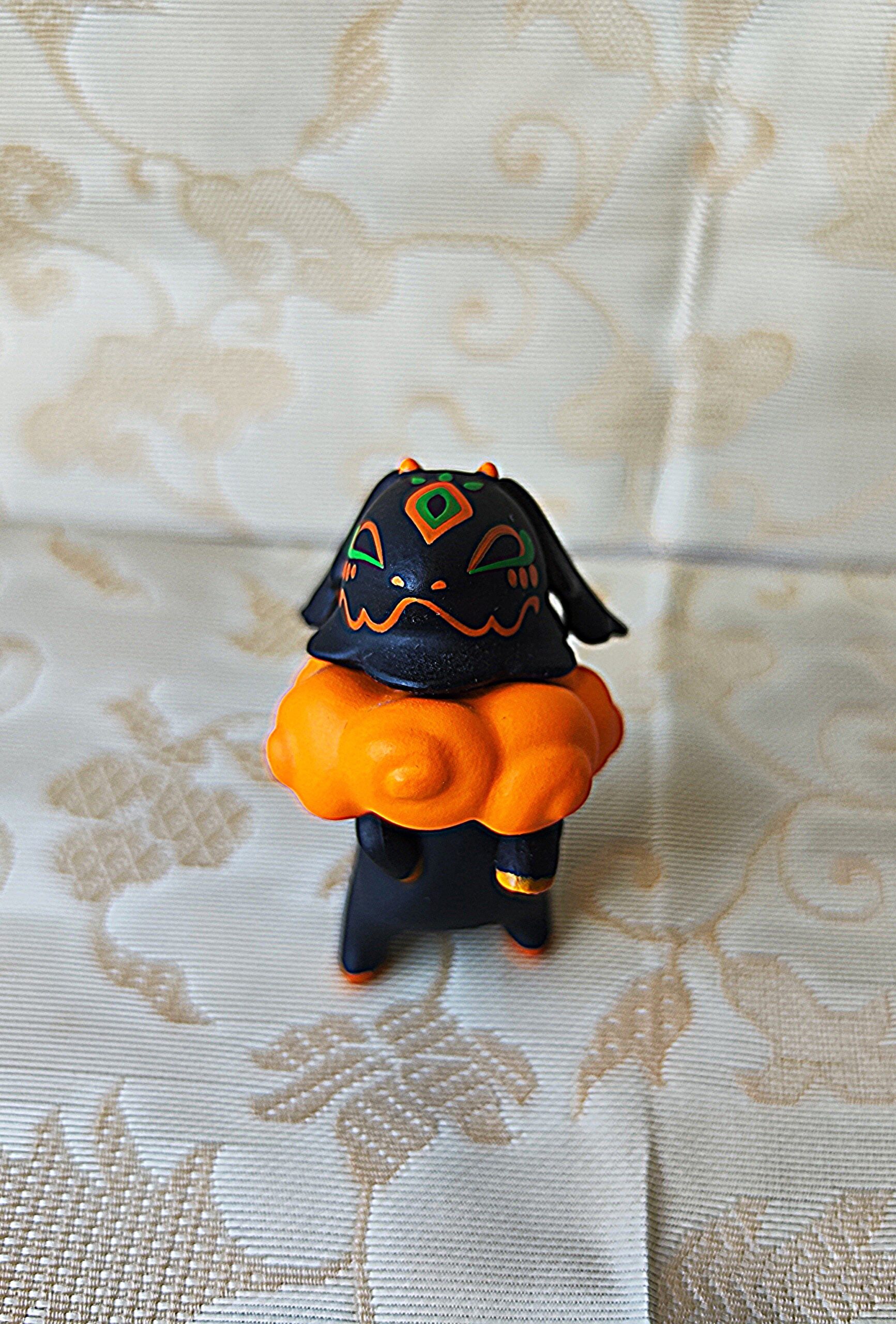 Découvrez cette figurine étonnante issue d’un gachapon japonais, représentant un animal noir (chien stylisé ou créature fantastique) avec des motifs colorés, debout sur un nuage orange éclatant. Son design mystérieux, ses motifs verts et orange sur la tête et le dos, ainsi que son allure énergique font de cette pièce un objet unique, symbole de la créativité des capsules japonaises.