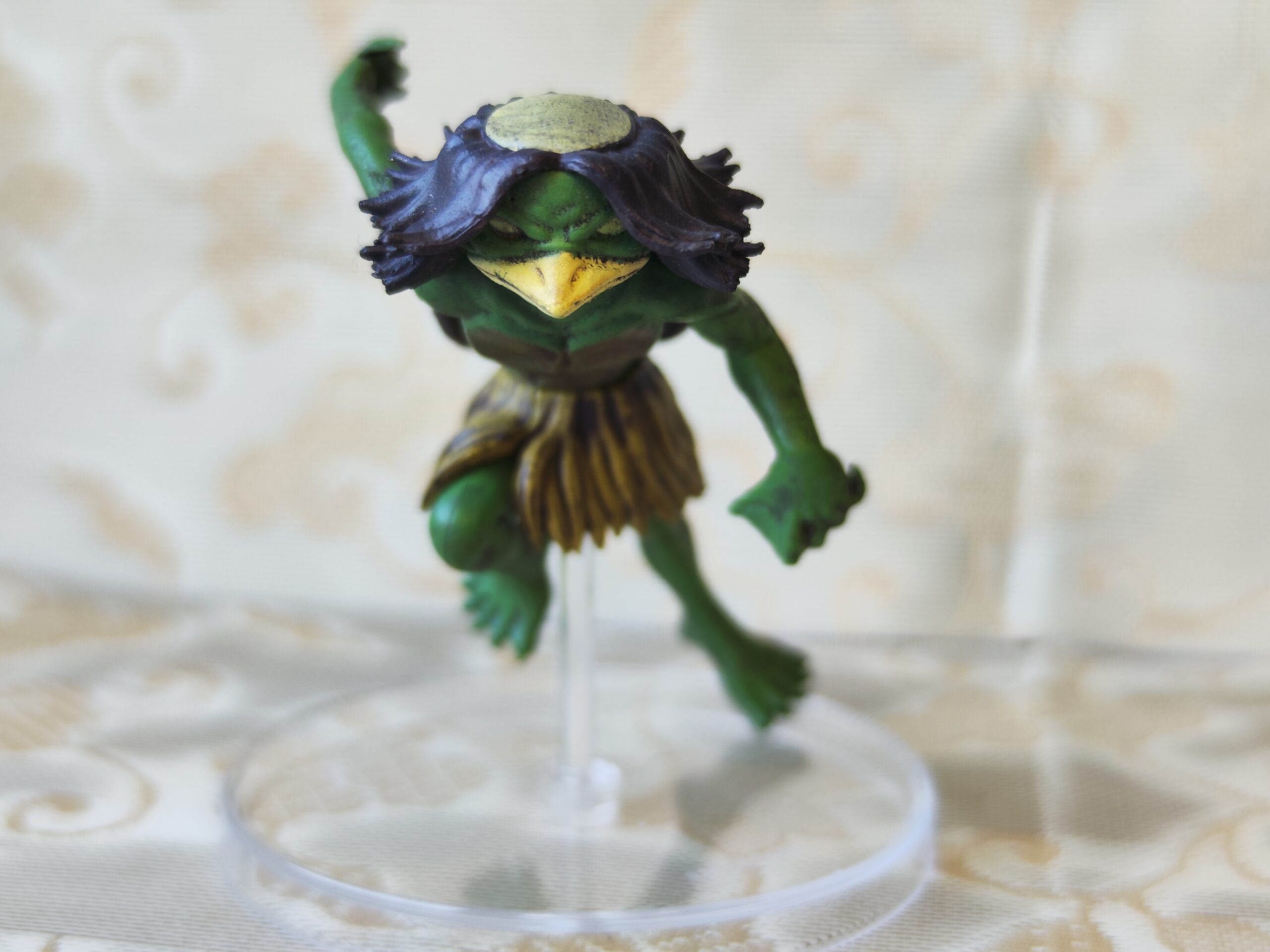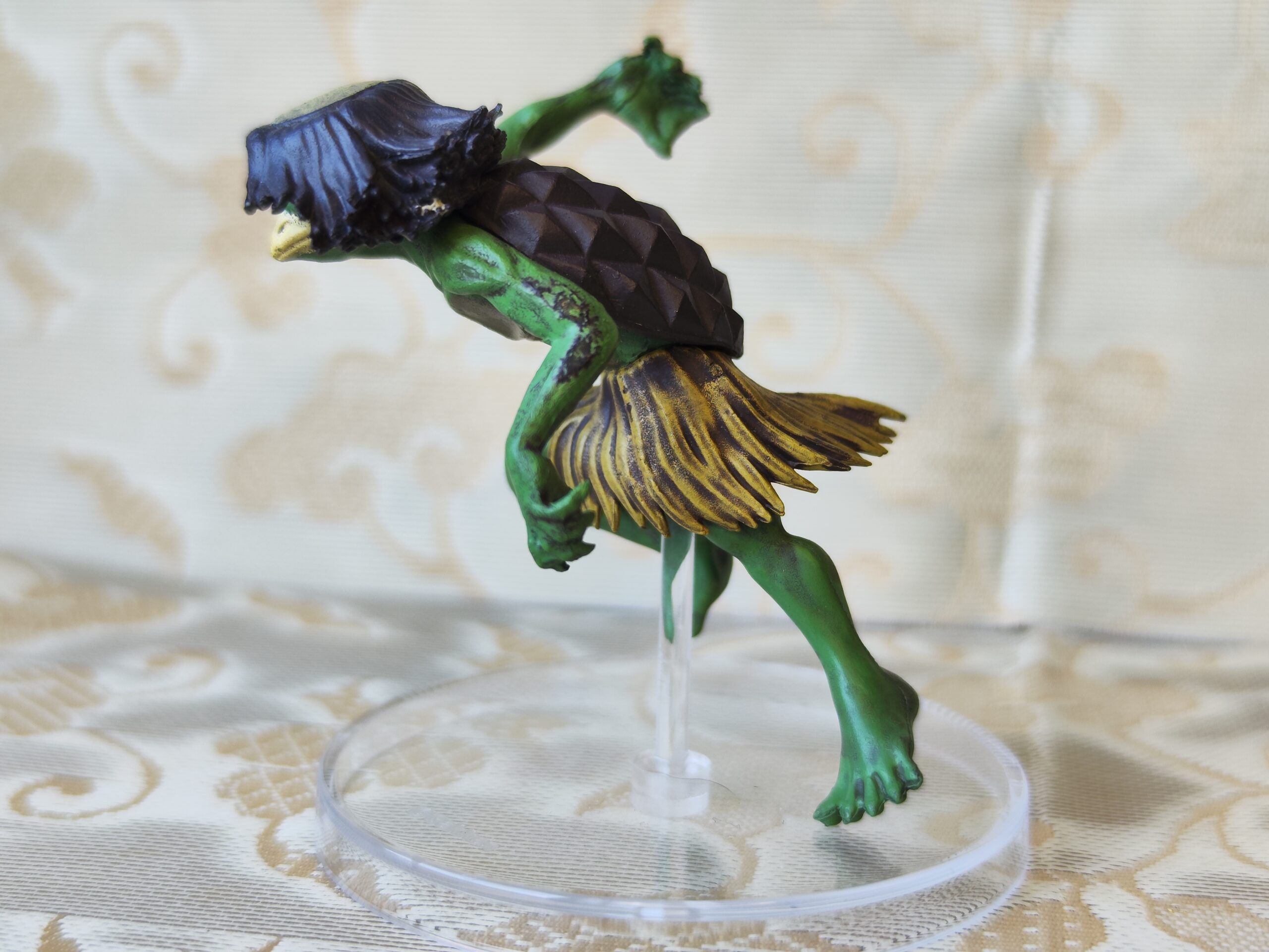 Découvrez cette figurine captivante issue d’un gachapon japonais, représentant un kappa, créature emblématique du folklore nippon ! Sculptée avec finesse, elle associe une posture dynamique à des détails authentiques : peau verte, bec jaune, cheveu sombre et carapace nervurée au dos. Le kappa porte une jupe traditionnelle, fidèle à l’imagerie classique, et trône fièrement sur un socle transparent.